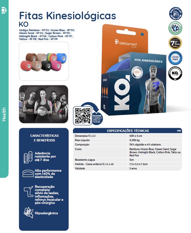 A fita é composta por algodão e 5% elastano, pesando cerca de 9g com dimensões de 500 x 5 cm. Está disponível em cores variadas como Rainbow, Ocean Blue, Classic Sand, Sugar Brown, entre outras. A embalagem mede 7,3 x 5,5 x 7 cm e tem validade de 3 anos, oferecendo produto com resistência e conforto e sem látex.